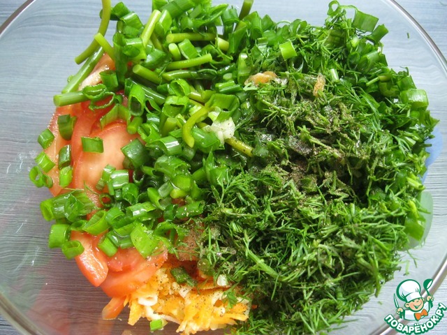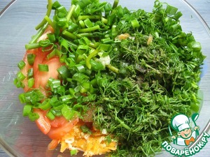 К кабачку и моркови добавить стрелы чеснока, помидоры и зелень. заправить яблочным уксусом и оливковым маслом. добавить черный молотый перец и досолить по вкусу. перемешать