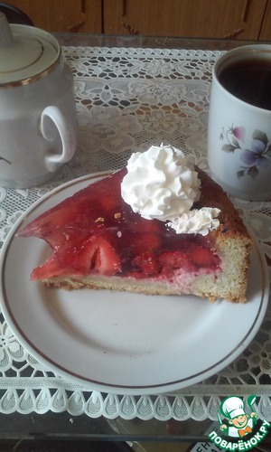 Корзинка из тонкого теста, полная свежей клубники. Так кратко можно описать этот пирог или торт. В нашей семье уже сложился своеобразный ритуал: обязательно испечь этот пирог с первой клубникой. Главное его достоинство то, что в нем минимум теста и ооочень много начинки из свежей клубники, которая не подвергалась тепловой обработке, и витамины в ней так и прыгают. Заходите, пробуйте.