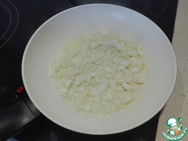 В сковороду наливаем 2 ложки оливкового масла и закладываем обжариваться лук и чеснок