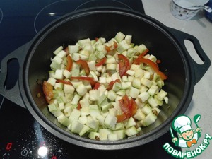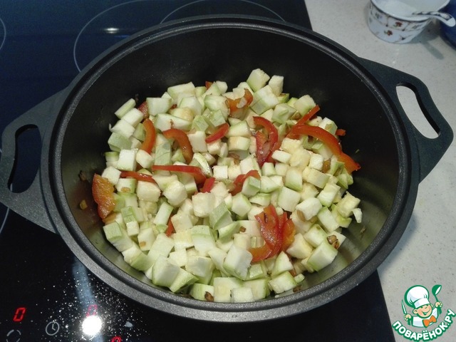 Добавляем кабачки в казан. Все перемешиваем и тушим