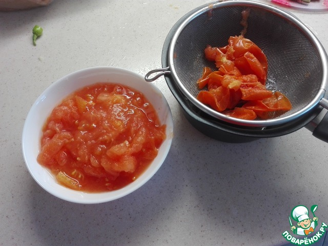 Берем помидоры, ошпариваем их и снимаем кожу. Нарезаем их на дольки, хотя дольками это после термической обработки назвать можно относительно.