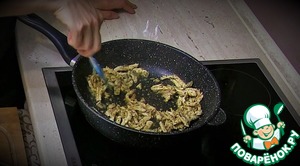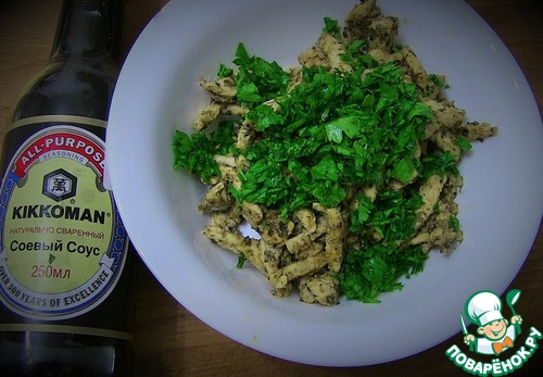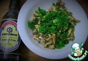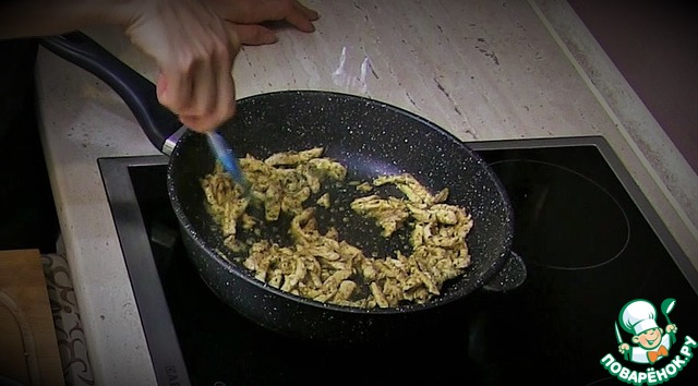 Куриное филе нарезать тонкими полосками и залить маринадом на 5-10 минут