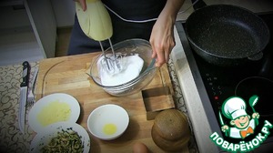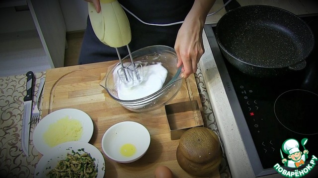 Отделить желток от белка у 1-го яйца. Белок взбить до мягких пик.