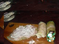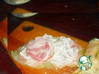 На капустный лист выложить филе куриное, смазать майонезом, смешанным с давленным чесноком.