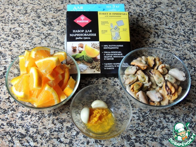 Смешать апельсины и мидии, залить маринадом и посыпать специями для рыбы ТМ Forester. Оставить на 30-60 минут.