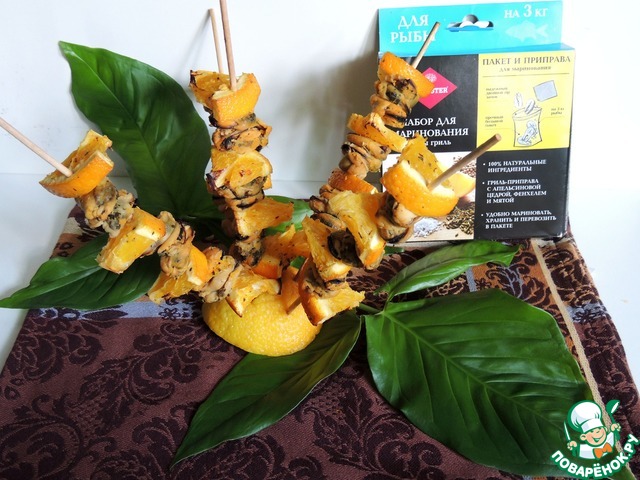 Кусочки апельсина и мидии (я брала по 3 штуки) нанизать вперемежку на замоченные деревянные шампуры. Обжаривать на гриле (на мангале или в духовке) 7-10 минут.
