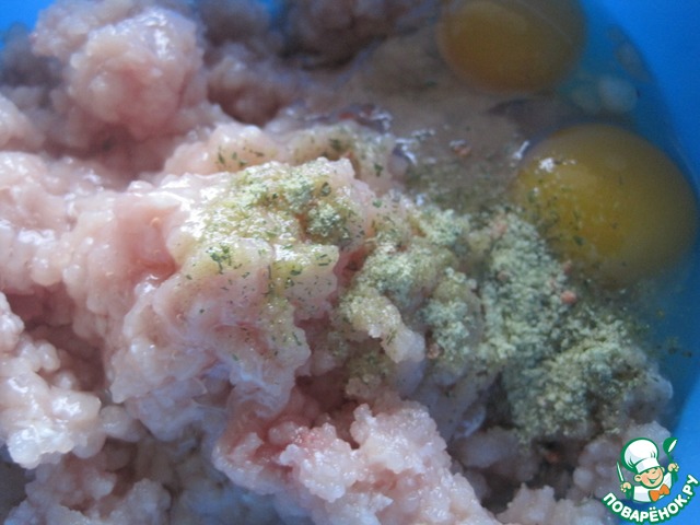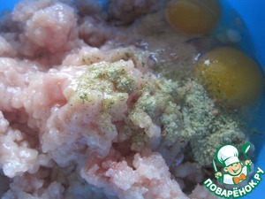 Приправу, соль и яйцо, тщательно перемешиваем слегка выбиваем.