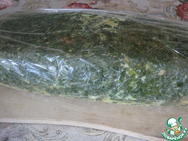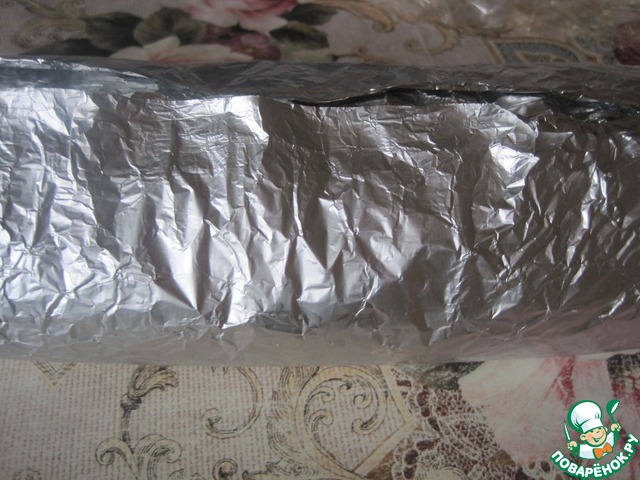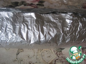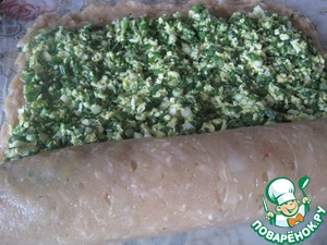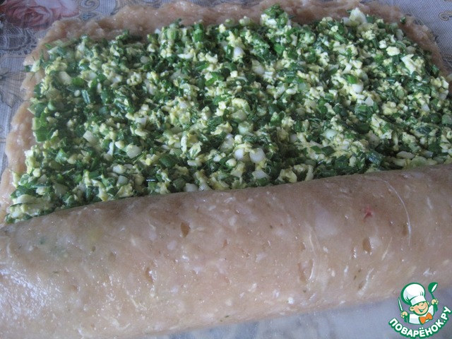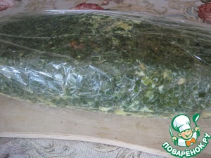 Сворачиваем пакетом, чтобы зелень покрывала всю поверхность рулета и запекаем еще 10 мин.