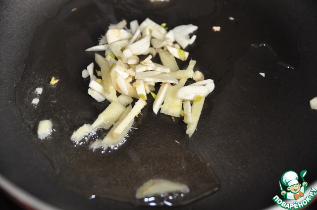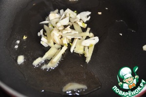 Чеснок и корень имбиря чистим и нарезаем тонкими полосками. На горячую сковороду наливаем растительное масло, кладём нарезанные чеснок и имбирь.