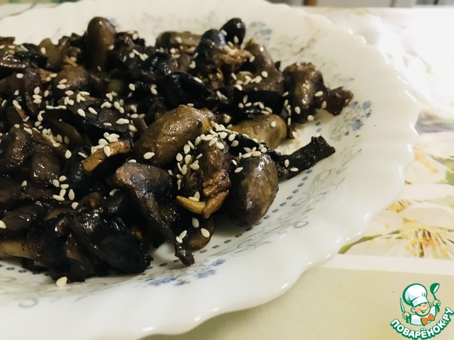 Подаём куриные сердечки в грибном соусе горячими, посыпав обжаренными (на сухой сковороде) семенами кунжута.