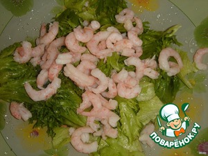 Листья салата крупно порвать, выложить в салатник, добавить креветки.