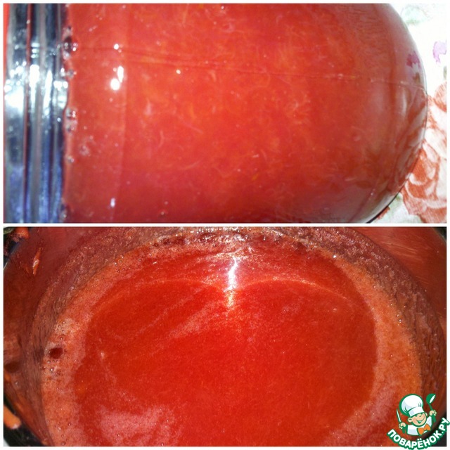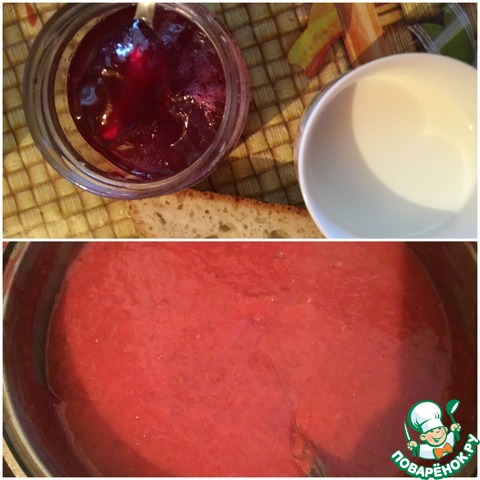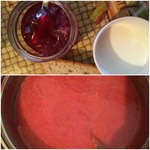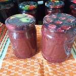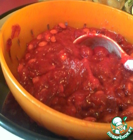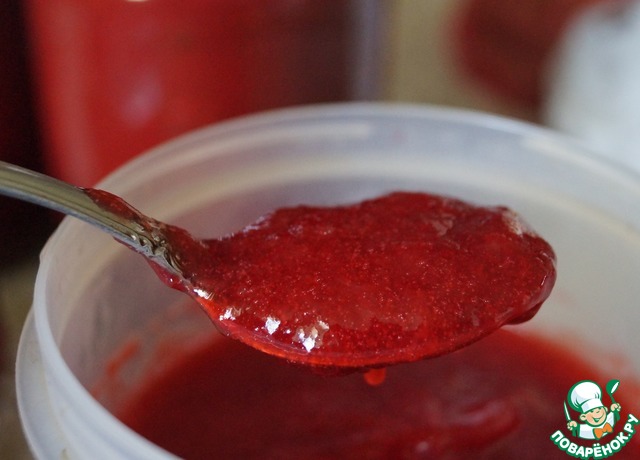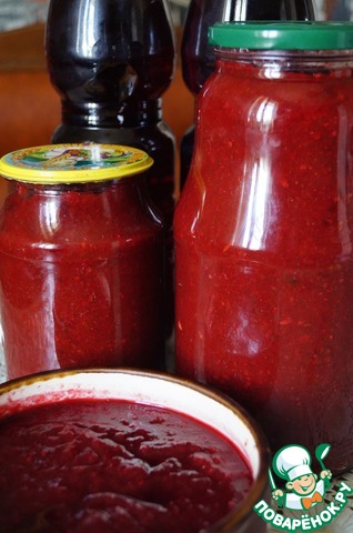 Протёртая масса - красивого рубинового цвета. Если хотите, в часть её добавьте сахар - и у вас получится лёгкий воздушный джем, хотите джем погуще - можно какое-то время поварить. Пардон, отвлеклась, у нас ткемали.