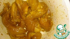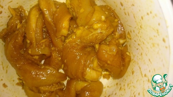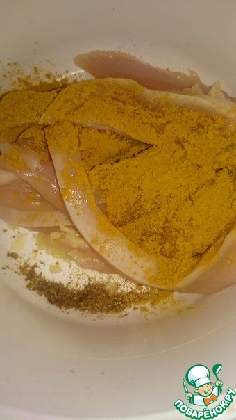 Снять мясо с куриной грудки, нарезать полосочками. Измельчить зиру и добавить к мясу вместе с куркумой.