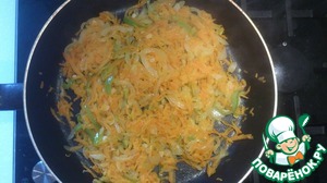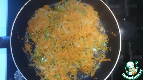 Морковь натереть, лук порезать полукольцами. Отправить овощи в разогретую сковородку. Немного обжарить. Мелко порезать острый перец и чеснок. Отправить в сковороду. Добавить измельчённые кориандр и чёрный перец. Обжарить ещё немного.