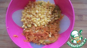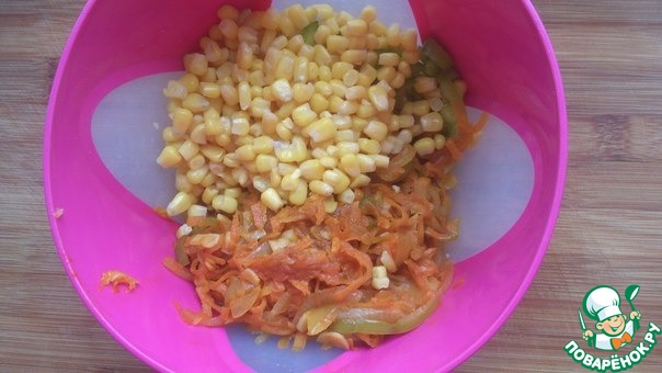Овощи остудить. Добавить к ним кукурузу и крахмал, перемешать.