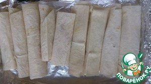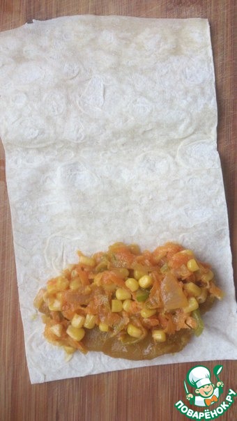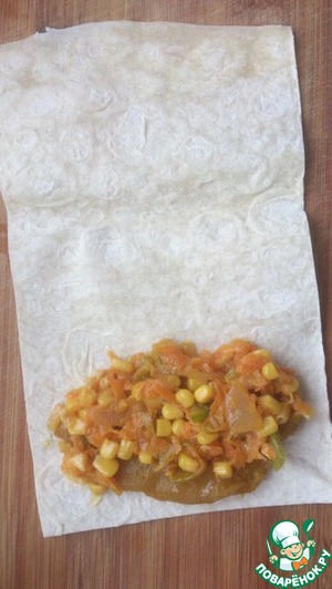 Лаваш разрезать на небольшие части, чтобы удобно было скручивать. На каждый кусочек лаваша выложить полосочку куриного мяса и ложку овощей. Завернуть.