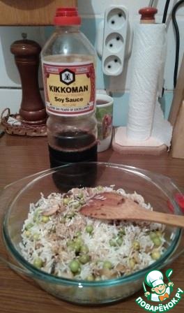 К рису добавить зеленый горошек и раскаленное масло с грибами, все очень хорошо перемешать, чтобы каждая рисинка была покрыта маслом. -