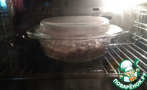 Налить в форму еще 50 мл, так чтобы вода только слегка покрыла весь рис, накрыть крышкой или фольгой и поставить в духовку еще на 20 минут.