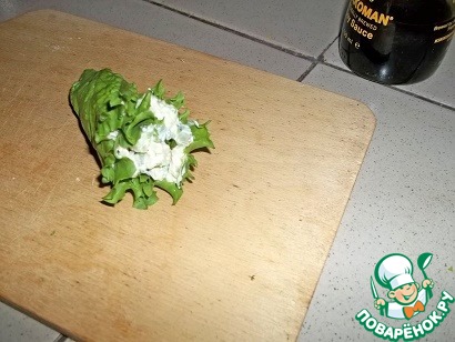 Закуска получается действительно свежей, пикантной, как прозрачные нотки флейты на фоне заката. Нежная начинка в слегка хрустящих салатных листьях. Такую начинку хорошо и просто намазать на кусочек поджаренного хлебушка на завтрак.