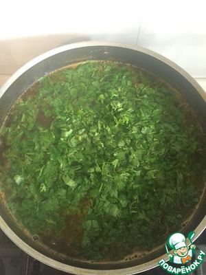Когда закипит содержимое кастрюли, добавьте соль, перец, чеснок по вкусу. Убавьте огонь, наполовину прикройте крышкой и оставьте вариться минут на 30. В самом конце добавьте мелко нарезанную зелень.