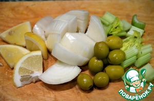 Обжигаем консервные банки на огне. Кладем на дно банок соль. Укладываем рыбу в банки. Произвольно нарезаем стебель сельдерея. Кладем в банку. Добавляем лук, маслины, дольки лимона и сливочное масло.