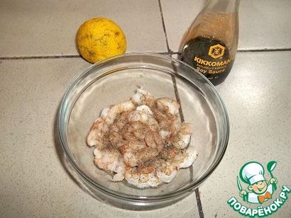 Маленькие креветки разморозить при комнатной температуре, промыть, залить лимонным соком и соевым соусом (по 1 чайной ложке), добавить щепотку черного перца и совсем немного соли.