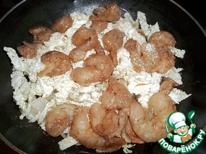 К луку добавить тонко нашинкованную китайскую (пекинскую) капусту и креветки вместе с маринадом, сливки. Т