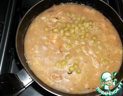 Выключить огонь, добавить зеленый горошек, перемешать. -