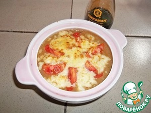 Вылить суп в 2 огнеупорные формочки (у меня одна форма, но порций в ней точно 2), сверху выложить нарезанные дольками помидоры и присыпать тертым сыром, поставить в разогретую духовку под гриль на 5-10 минут.