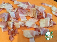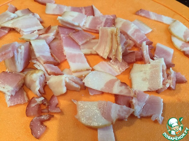 Бекон нарежьте тонкими полосками. |