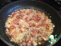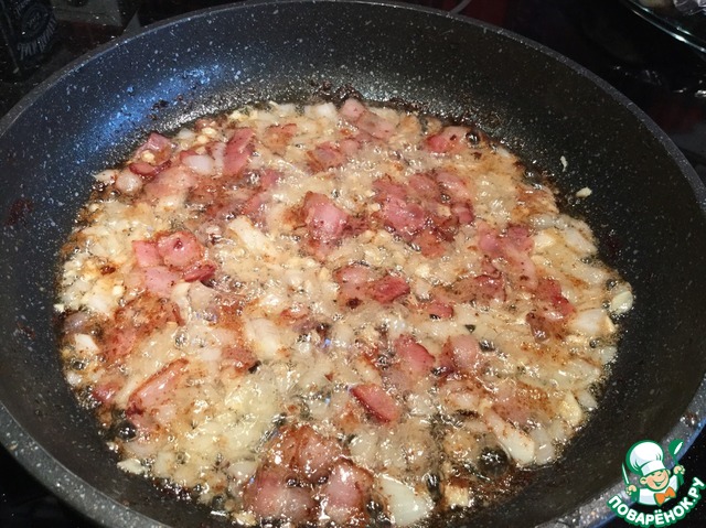 Добавьте к бекону и жарьте до прозрачности лука. |