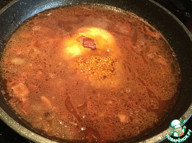 Добавьте бульон, мёд, дижонскую и зернистую горчицу, перемешайте и дайте закипеть. |