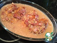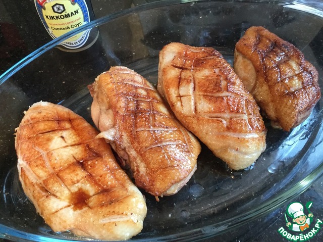 Залейте получившимся соусом утиные грудки и готовьте в духовке около часа. За время приготовления 3-4 раза переверните грудки. |