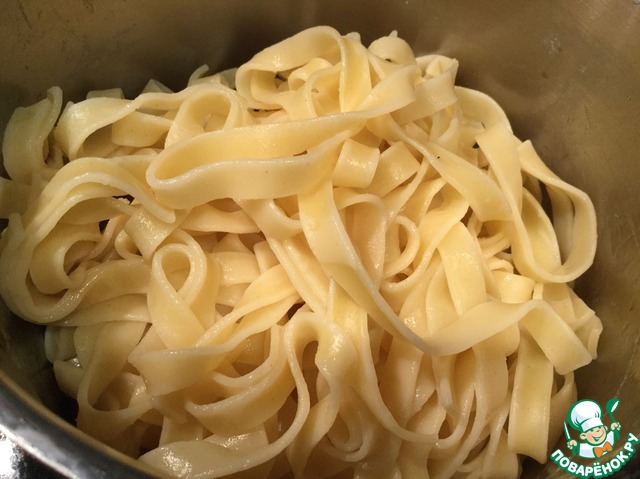 Пока они готовятся сварите фетучини, как указано на упаковке. |