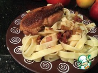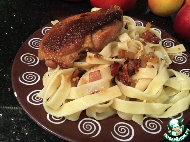 Выложите фетучини на тарелку, обильно полейте соусом и выложите утку. Подавайте. |