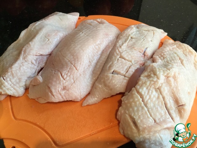 Духовку разогрейте до 170 градусов. Утиный грудки помойте, обсушите бумажным полотенцем. Сделайте на коже надрезы, аккуратно, не повредив мясо. |