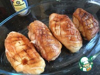 Выложите грудки в форму для запекания, полейте каждую 1 ст. л. соевым соусом, накройте фольгой и пока готовится соус сохраняйте тёплыми. |