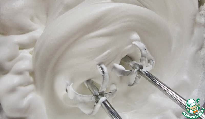 Взбить белки на максимальной скорости миксера до устойчивой пены. -