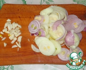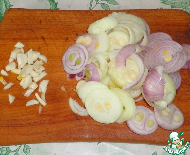 Лук репчатый нарезать кольцами, на несколько частей порезать зубки чеснока.