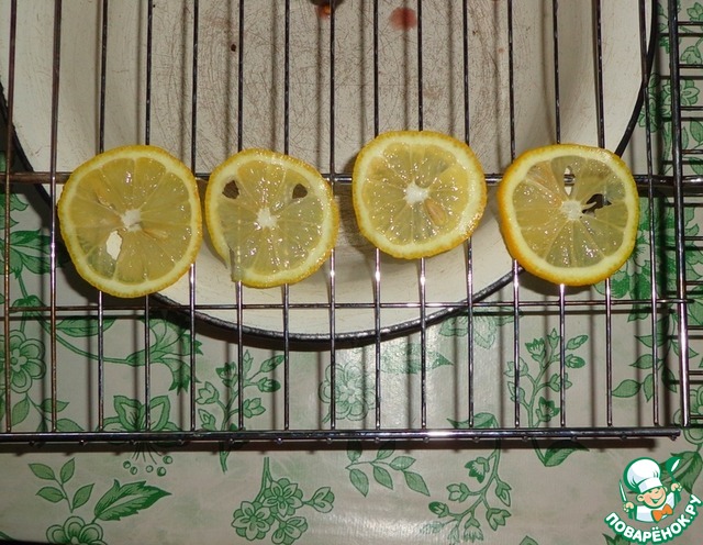 Открываем решетку-гриль, смазать её растительным маслом. Лимон порезать на тоненькие кружочки. По решетке разложить лимон.