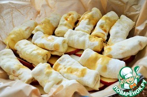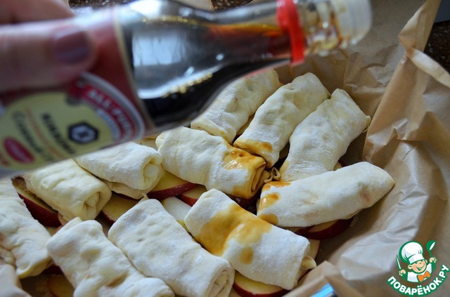 На припыленном столе тесто нарезать на квадраты по 8 см., не раскатывая. На квадрат выложить по две подушечки, свернуть рулетом. -