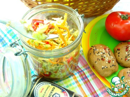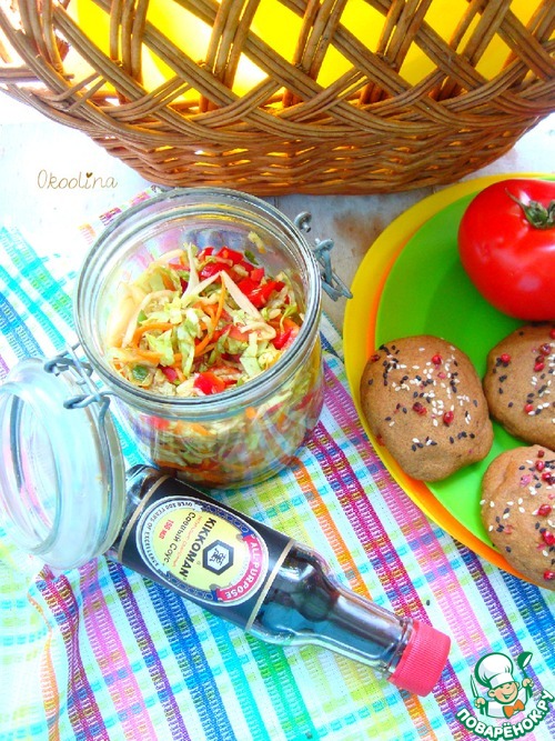 Салат из молодой капусты, моркови, болгарского перца с луком и чесноком, заправленный соусом KIKKOMAN с бальзамиком и подсолнечным маслом. Салат хорошо сделать дома, переложить в баночку и взять с собой на пикник, пока мы добираемся, он настоится и будет очень вкусным.