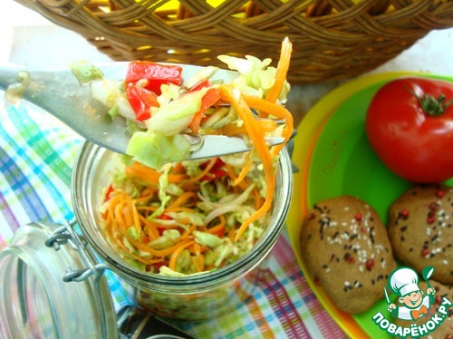 Выкладываем в стеклянную банку, закрываем её и берём на природу. Если просто делаем салат для обеда или ужина, то ставим банку с салатом в холодильник -настояться. Для меня! Чем больше времени стоит салат в холодильнике, тем он вкусней! Хотя можно начинать его есть и сразу-тоже вкусно, например тогда, когда нагрянут неожиданные гости.