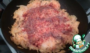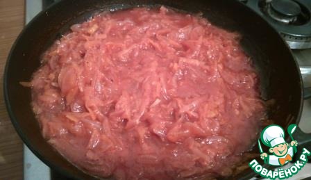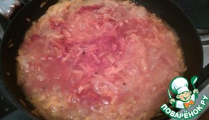Затем добавить томатную пасту и 2 половника жидкости из кастрюли с картошкой. Все хорошо перемешать, накрыть крышкой и тушить на маленьком огне минут 10