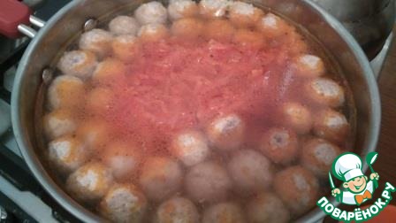 В кастрюлю с картошкой по одной добавить фрикадельки,