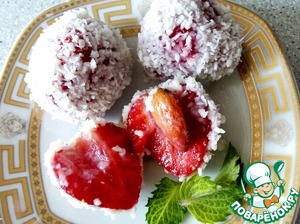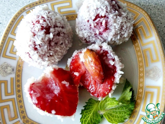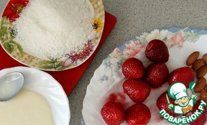3. Клубнику с миндалём внутри обильно обволакиваем в сгущенном молоке. После чего - обваливаем в кокосовой стружке.