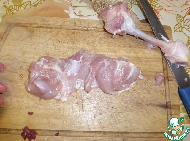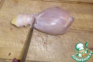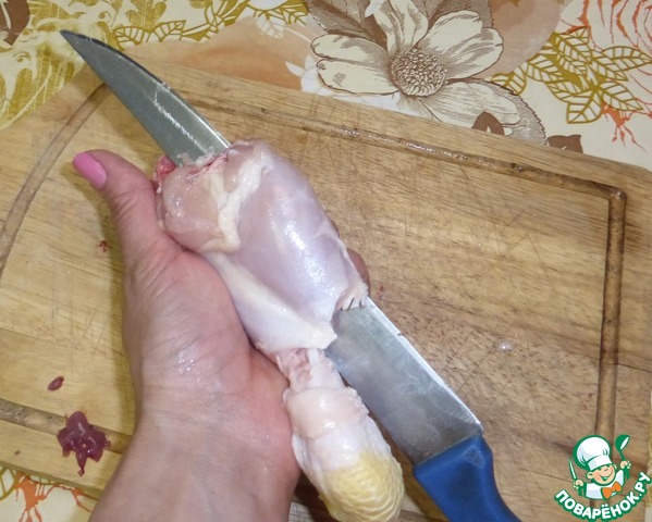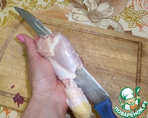 А теперь начинаем снимать мясо, как чулок. Снимаем аккуратно, нам нужен один кусок мяса, а не много маленьких.