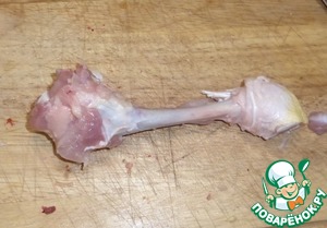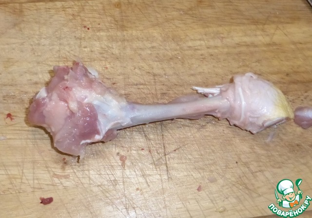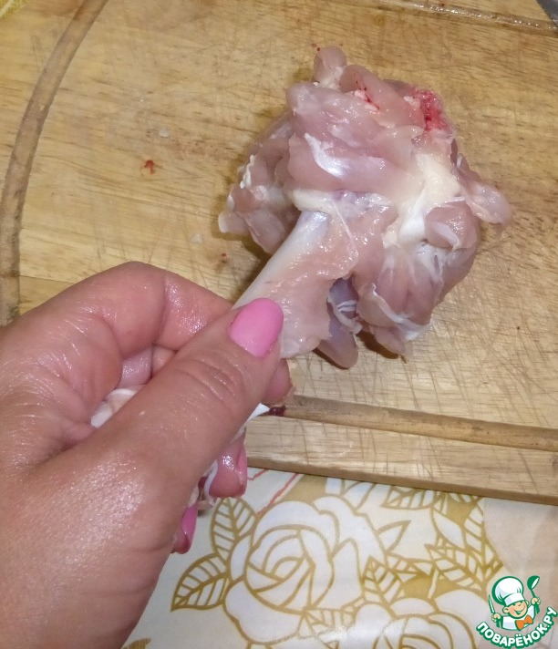 У хряща по кругу обрезаем мясо, чтобы получился вот такой кусочек. Повторюсь, желательно, чтобы он был цельный, курицу не очень удобно насаживать - она мягкая, рвется.
