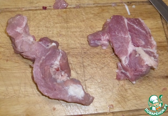 Теперь режем на кусочки свинину. Режем толщиной около 2 см.
