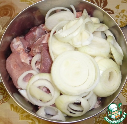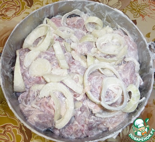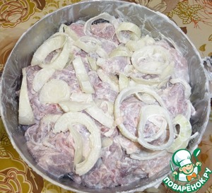 Потом все сдвигается. При желании можно между кусочками мяса проложить кольца лука. Ну да, это все знают:))